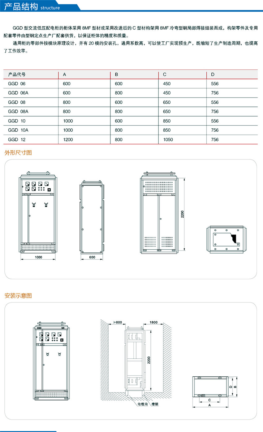 GGD型交流低壓配電柜是根據(jù)能源部主管上級,廣大電力用戶及設(shè)計(jì)部門的要求,本著安全、經(jīng)濟(jì)、合理、可靠的原則設(shè)計(jì)的新型配電柜。產(chǎn)品具有分?jǐn)嗄芰Ω?,動熱穩(wěn)定性好,電氣方案靈活、組合方便,系列性、實(shí)用性強(qiáng),結(jié)構(gòu)新穎、防護(hù)等級高等特點(diǎn),可以作低壓成套開關(guān)設(shè)備的更新?lián)Q代產(chǎn)品使用。并且廣泛適用于發(fā)電廠、變電所、工業(yè)企業(yè)等電力用戶作為交流50HZ,額定工作電壓380V,額定電流至3150A 的配電系統(tǒng)中作為動力,照明及配電設(shè)備的電能轉(zhuǎn)換、分配與控制之用。該產(chǎn)品分?jǐn)嗄芰Ω?,額定短結(jié)構(gòu)新穎等特點(diǎn)。該產(chǎn)品是我組裝式、固定面板開關(guān)柜的代表產(chǎn)品之一。