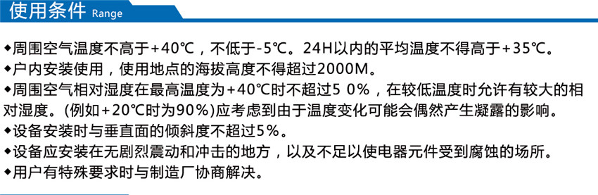 裝置適用于發(fā)電廠、石油、化工、冶金、紡織、高層建筑等低壓配電系統(tǒng)。海拔高度不超過1000m;周圍環(huán)境溫度-25℃ - +40℃;無導(dǎo)電性塵埃、腐蝕性氣體和水蒸氣的場所;無火災(zāi)和爆炸危險(xiǎn)的場所;無經(jīng)常性劇烈震動場所。