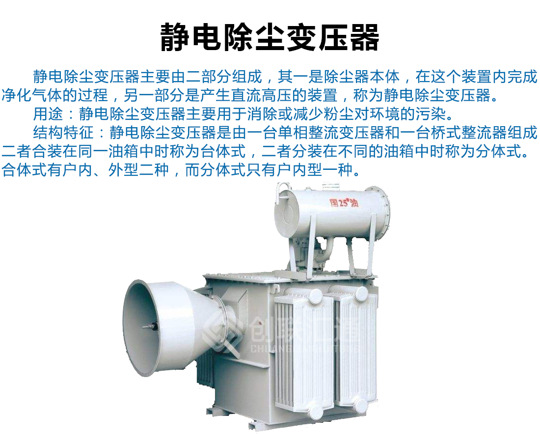 靜電除塵變壓器適合于工業(yè)部門的除塵、除霧、脫水、雜質(zhì)分離和回收稀有金屬及其他原料等方面應用。